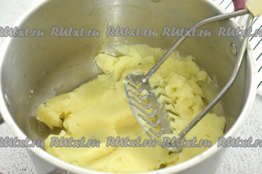 Варёный картофель разминаем толкушкой до получения однородного пюре.