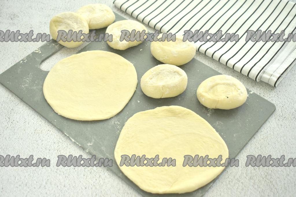 Каждый кусочек теста ставим на срез и раскатываем в лепёшку диаметром 11 сантиметров.