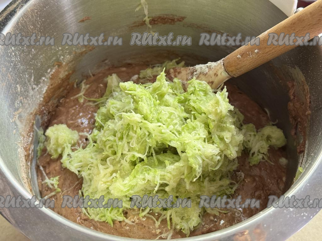Натёртую кабачковую массу отжать от лишнего сока (можно просто брать понемногу натёртые кабачки в руку и сжимать, отжимая лишний сок, выделившийся сок нам не понадобится). В получившееся шоколадное тесто добавить кабачковую массу, отжатую от лишней влаги. Перемешать тесто до однородности лопаткой.