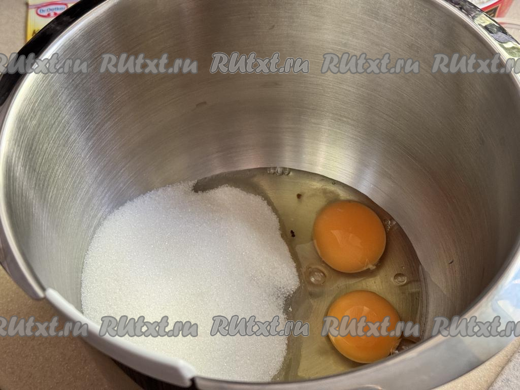 Взбить яйца с сахаром в течение 3-4 минут на максимальных оборотах миксера (яичная масса должна посветлеть и увеличиться в объёме).