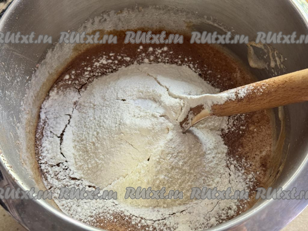 Всыпать соль, разрыхлитель, грамм 150 просеянной муки, перемешать шоколадное тесто до однородности.