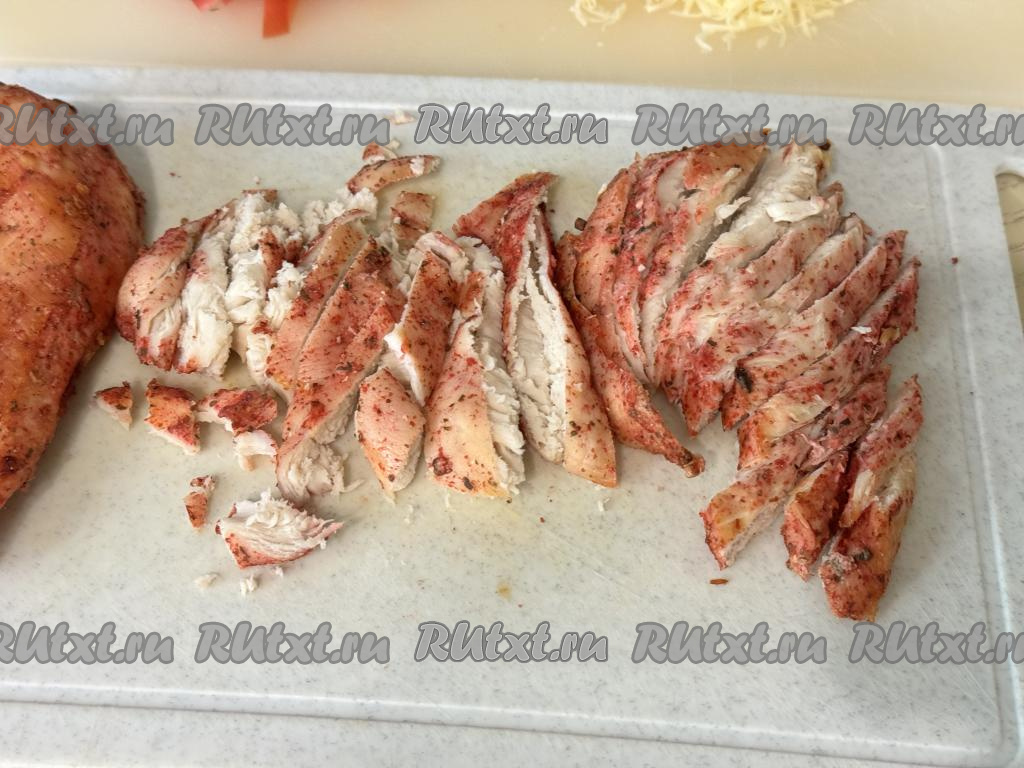Готовое филе достать из аэрогриля, дать остыть, выложить на доску и нарезать на длинные брусочки (или порвать на волокна с помощью вилки).