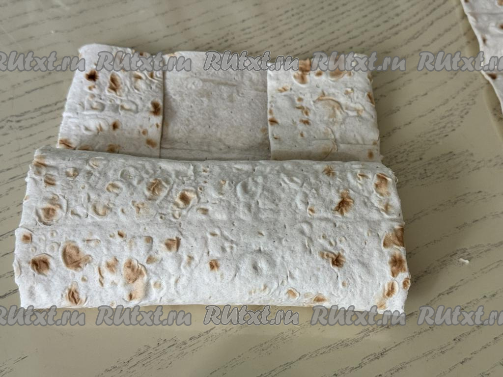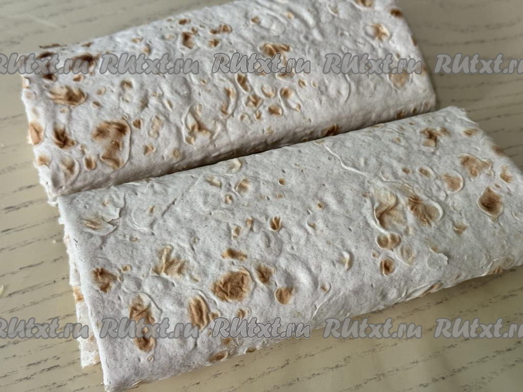 Вначале подвернуть немного два длинных края лаваша на начинку, а затем, начиная с края с начинкой, свернуть лаваш в рулет.