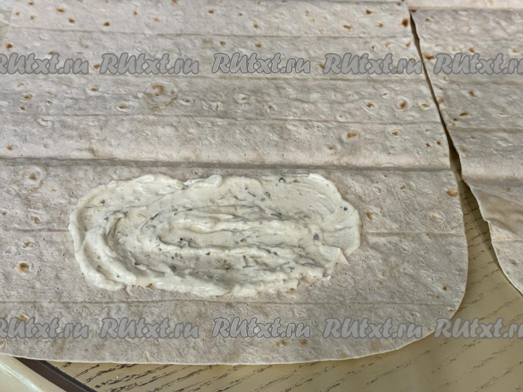 Теперь можно приступать непосредственно к формированию шаурмы. Из предложенного количества ингредиентов мы будем формировать 4 шаурмы. Взять 1 лист лаваша. Ближе к одному краю лаваша, отступая от краёв лаваша, выложить 1 столовую ложку соуса, немного его разровнять.
