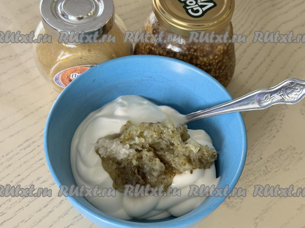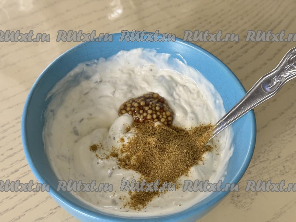 Перемешать соус, добавить горчицу (у меня - зернистая) и специи (в качестве специй я добавила 1 чайную ложку порошка карри).