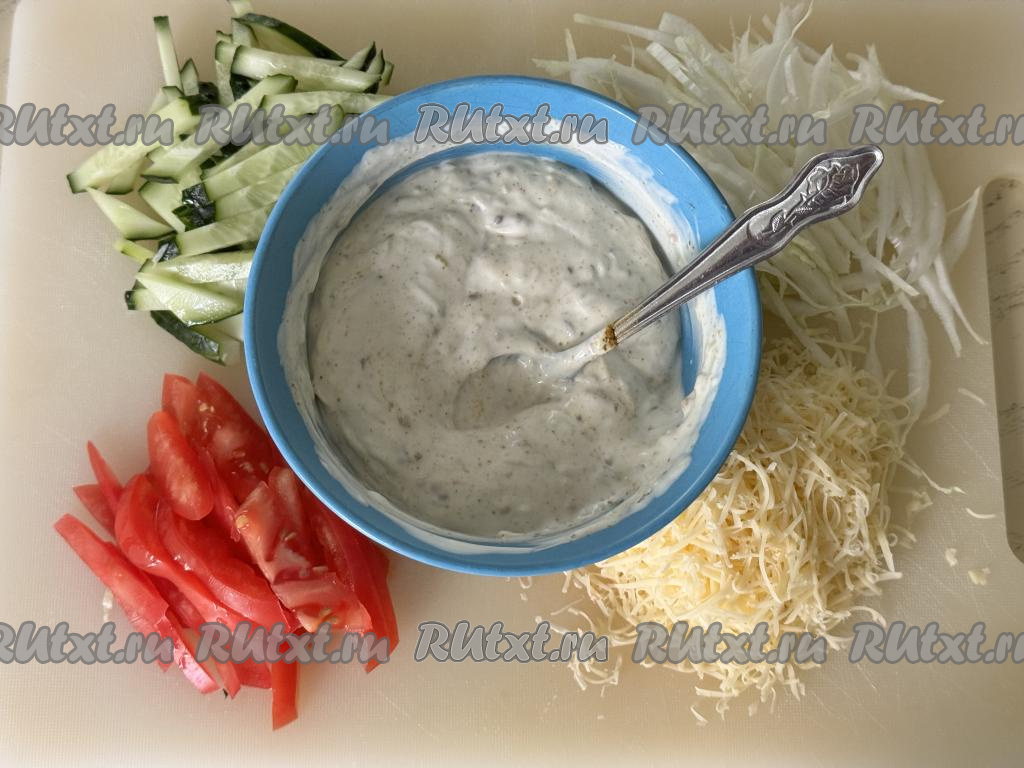 Ещё раз перемешать соус для шаурмы. Огурцы нарезать на длинные брусочки, капусту - на тонкие полоски, помидоры - на тонкие кусочки. Сыр натереть на мелкой тёрке.
