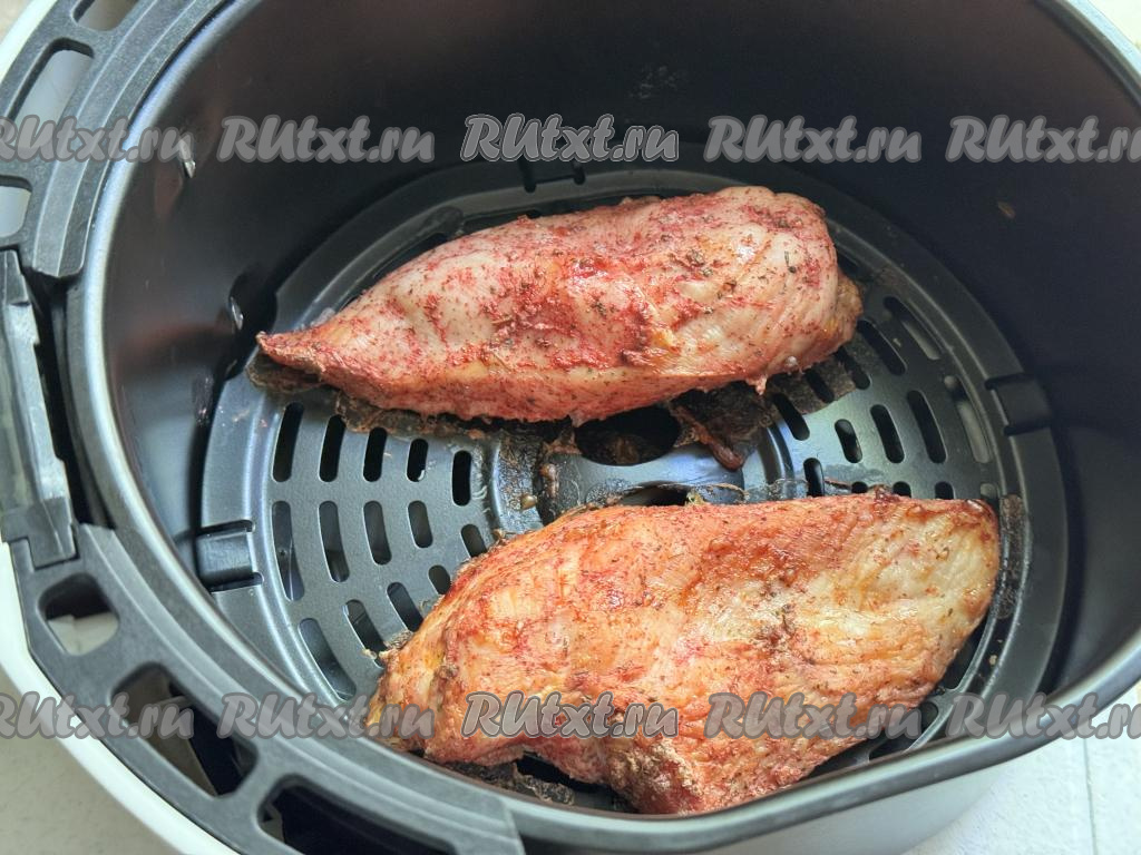 Выложить куриное филе на решётку аэрогриля, запекать под закрытой крышкой при температуре 180 градусов 25 минут (до готовности мяса).