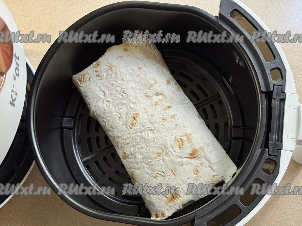 Выставить в аэрогриле температуру 200 градусов, крышку закрыть, запекать шаурму 5-7 минут (до лёгкого золотистого цвета лаваша).