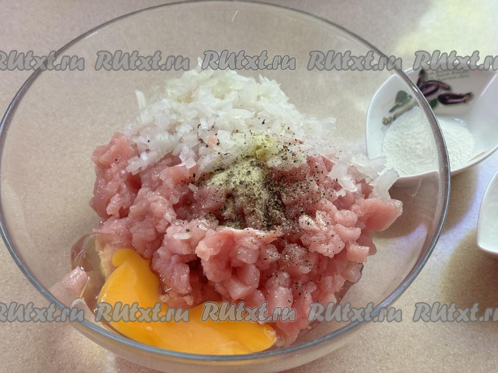 В миску с мелко нарезанной свининой добавить крахмал, муку, лук и сырое яйцо, посолить и поперчить по вкусу.
