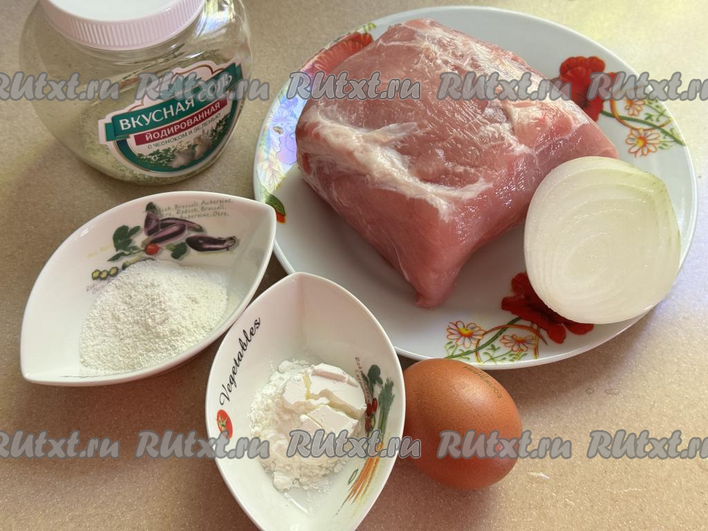 Подготовить продукты. Свинину промыть водой, обсушить. Крахмал можно взять как картофельный (именно его я и использовала), так и кукурузный. Лук почистить.