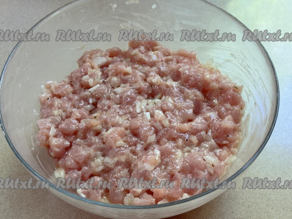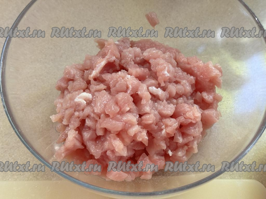 Нарезать свинину ножом вначале на тонкие ломтики, а затем порубить ножом на мелкие кусочки.