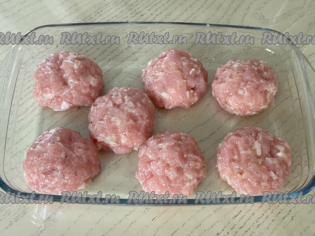 Руки смочить водой, разделить рубленную массу из свинины на 7 равных частей. Из каждой части рубленной массы сформировать круглую котлету, выложить в жаропрочную форму. В форму с 7 сформированными рубленными котлетами из свинины влить 100 миллилитров воды, отправить в духовку, разогретую до 180 градусов.