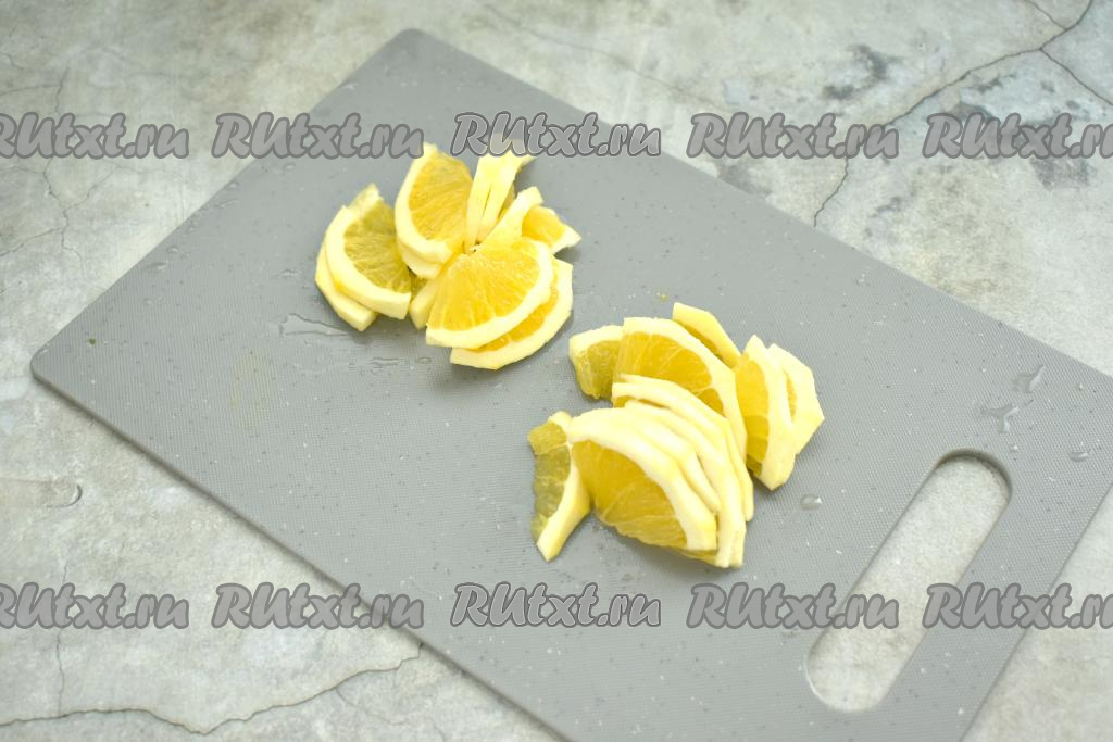 Количество ингредиентов рассчитано на 2 банки объёмом по 1 литру. Срезаем с апельсина кожуру. Нарезаем апельсин на тонкие полукольца (или четверть кольца), обязательно удаляя косточки.