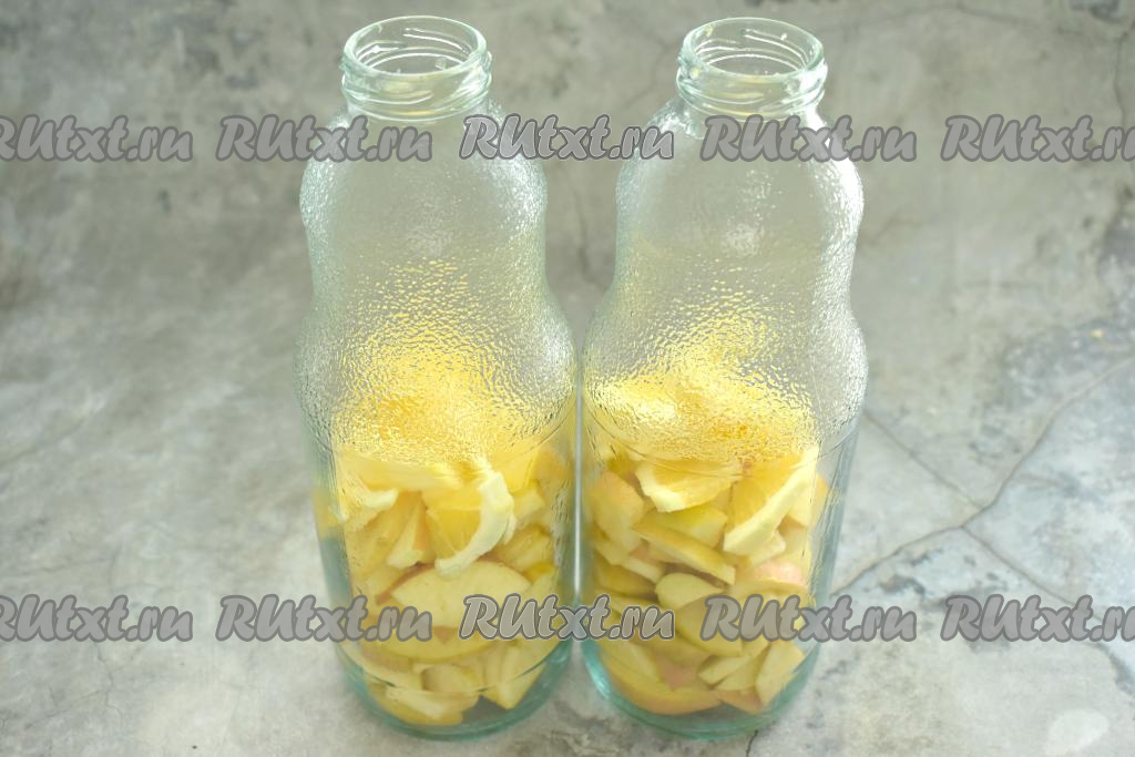 Банки для компота (я взяла 2 банки по 1 литру) стерилизуем удобным способом (я стерилизую над паром в течение 3-4 минут), кипятим крышки к банкам (я кипячу в течение 3-4 минут с момента закипания воды в кастрюле). Нарезанный апельсин и яблоки равномерно распределяем по простерилизованным банкам.