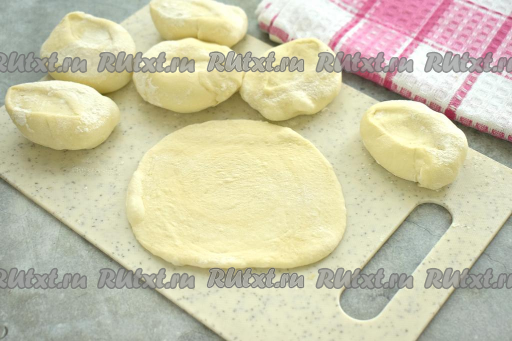 Каждый кусочек теста ставим на срез и прижимаем сверху ладонью. Раскатываем каждый кусочек теста в лепёшку диаметром 10-11 сантиметров.