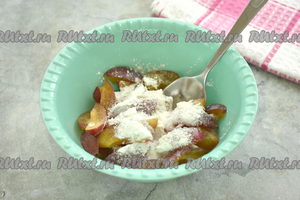 Половинки слив разрезаем на четвертинки, выкладываем в миску. К сливам всыпаем сахар и картофельный (или кукурузный) крахмал, перемешиваем и начинка для слоёных пирожков готова.