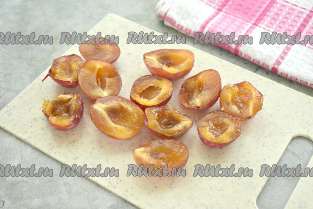 Для этой выпечки можно взять и слоёное дрожжевое тесто (именно его я и купила), и слоёное бездрожжевое тесто. Размораживаем слоёное тесто при комнатной температуре. Сливы моем, разрезаем пополам, удаляем косточки.