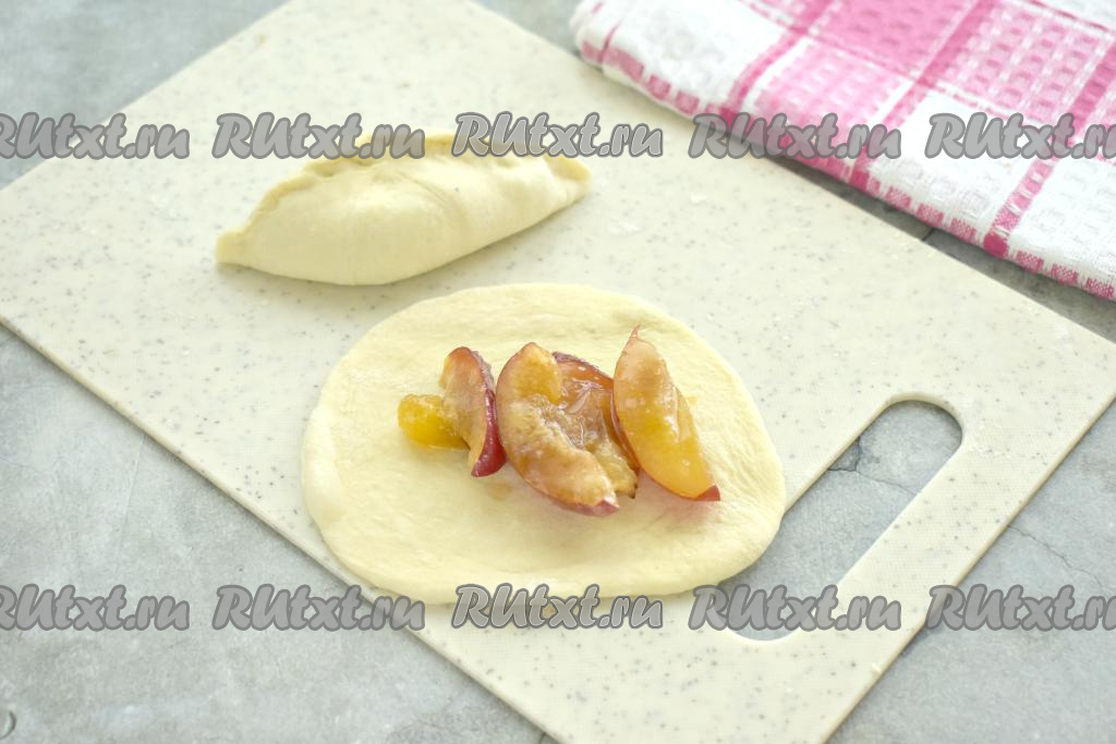 Начинку из слив зрительно делим на 7 равных частей (по количеству пирожков, которые мы планируем лепить). В центр лепёшки из слоёного теста выкладываем часть сливовой начинки. Скрепляем края лепёшки над начинкой, формируя пирожок. Постепенно лепим все 7 слоёных пирожков со сливами.
