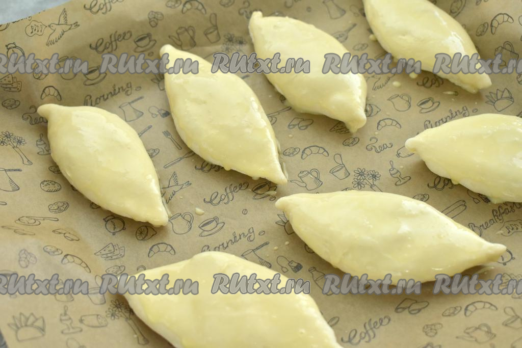 Пирожки выкладываем "швом" вниз на противень, застеленный ковриком (или пергаментом) для выпечки. В небольшую ёмкость выкладываем яичный желток, вливаем 1 столовую ложку молока, взбиваем вилкой до однородности, затем получившейся смесью смазываем поверхность пирожков.