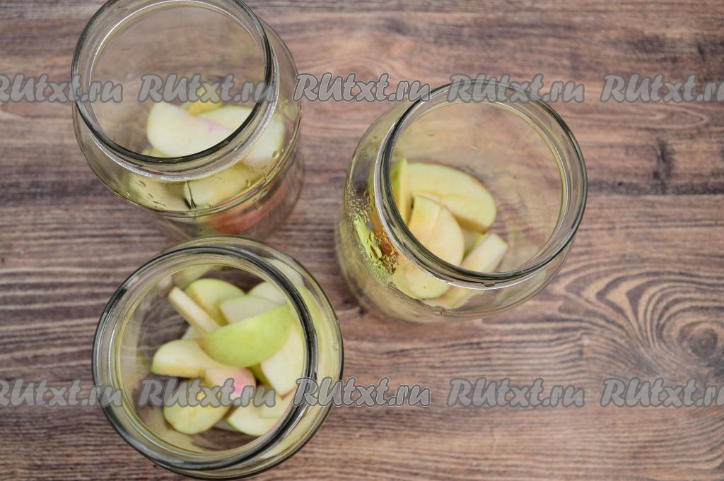 Равномерно распределить дольки яблок по 3 простерилизованным банкам.
