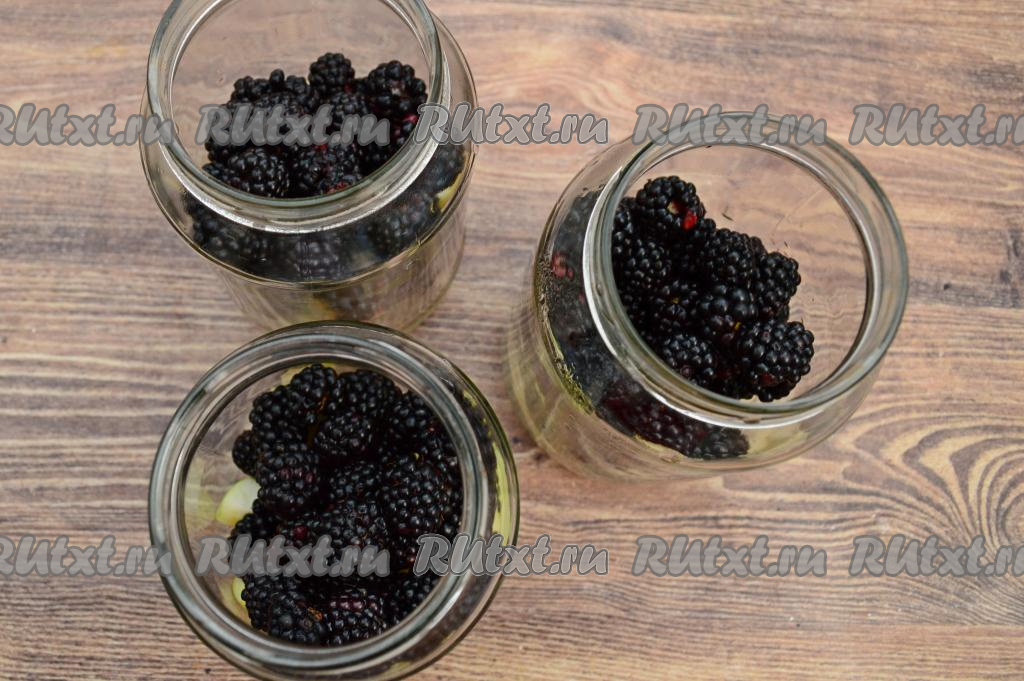 Подготовленную ежевику равномерно распределить по банкам с яблоками.