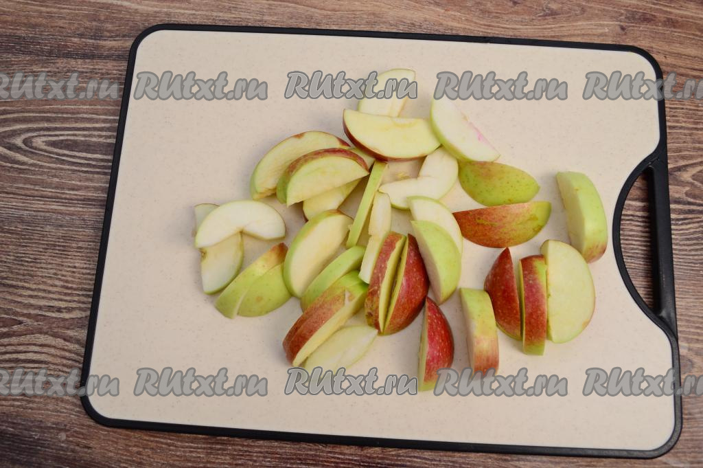 Налить в чайник (или в кастрюлю) 2,5 литра воды, поставить закипать на сильный огонь. Пока закипает вода, займёмся ягодами и фруктами. Яблоки нужно нарезать на не очень тонкие дольки, обязательно удаляя семенную коробку с косточками.