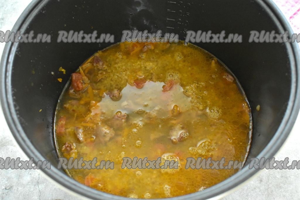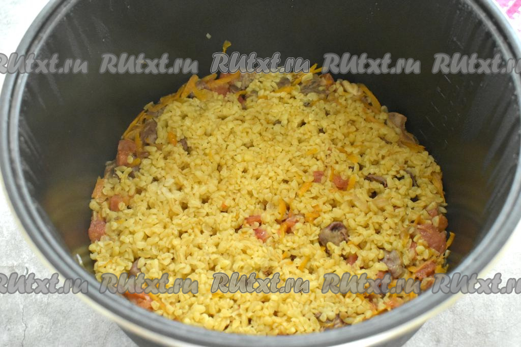 Вливаем к булгуру, овощам и куриным сердечкам 400 миллилитров горячей воды, закрываем крышку мультиварки.