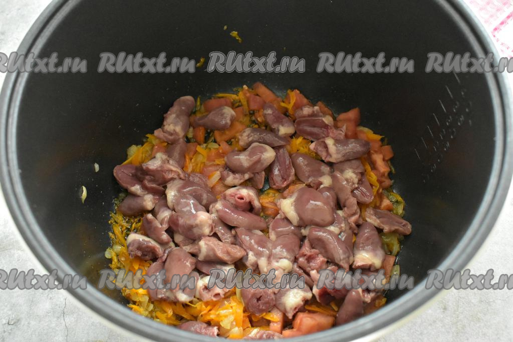 Затем к моркови и луку, обжаренным с помидорами, выкладываем подготовленные куриные сердечки, перемешиваем, обжариваем оставшиеся 7 минут (до окончания программы "Жарка").
