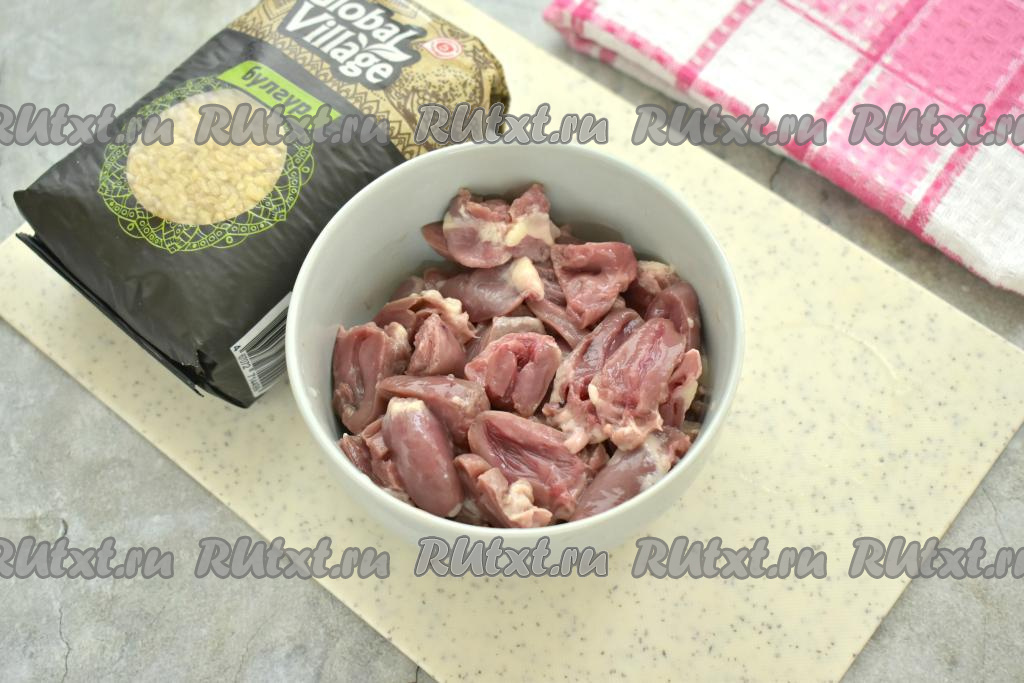 Куриные сердечки разрезаем пополам, хорошо промываем водой, удаляя сгустки крови. Морковь и лук очищаем.