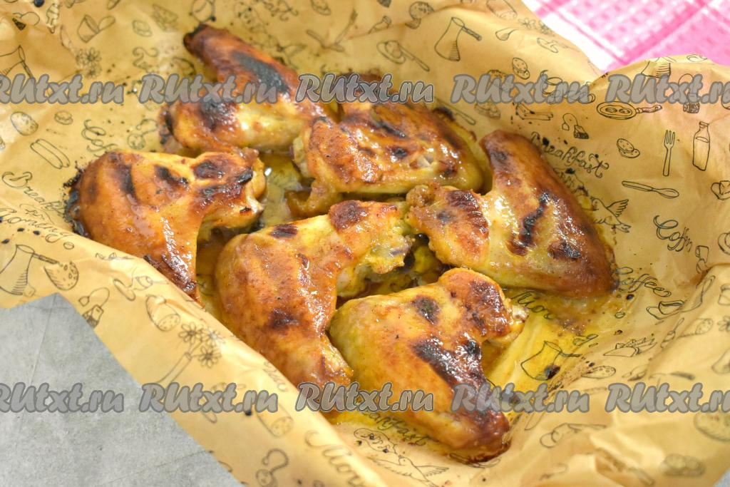 Ставим форму в духовку, прогретую до 180 градусов, запекаем куриные крылышки в горчично-медовом соусе минут 45. Крылья должны хорошо подрумяниться сверху.