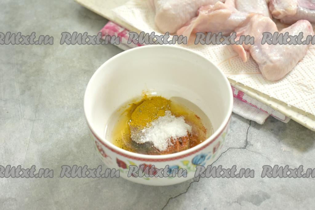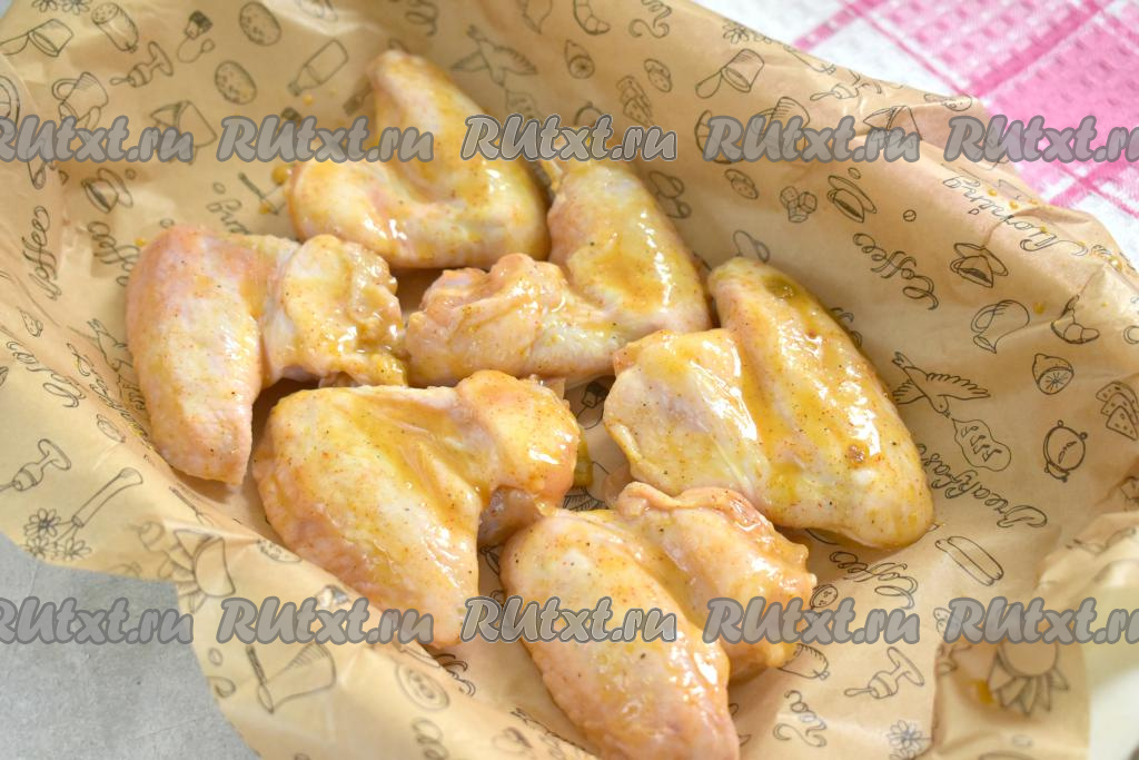 Подготовленные куриные крылышки выкладываем в миску с горчично-медовым соусом, перемешиваем, покрывая крылья мёдом и горчицей со всех сторон. Миску с крылышками, покрытыми соусом, затягиваем пищевой плёнкой (или накрываем крышкой) и отправляем в холодильник мариноваться минимум на 30 минут.