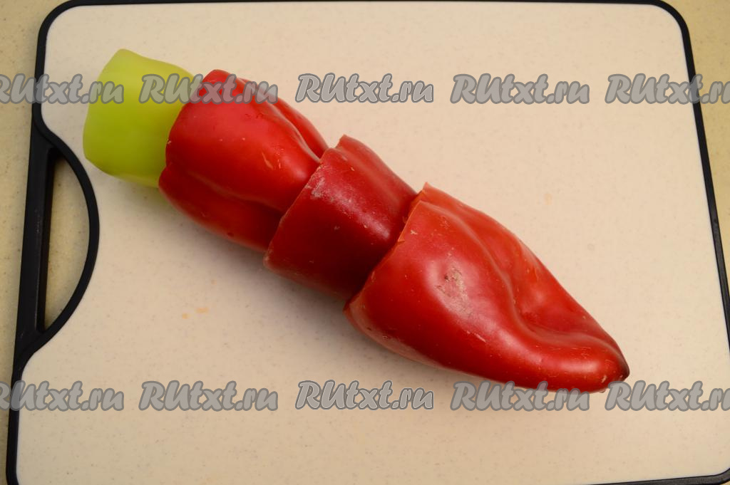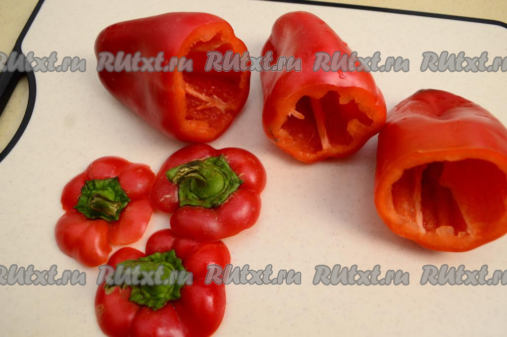 Срезать у перцев острым ножом верхушку вместе с чашелистиком. Удалить из болгарских перцев перегородки и промыть их внутри проточной водой, чтобы избавиться от семечек. Стряхнуть с перцев воду, которая осталась после промывания овощей.