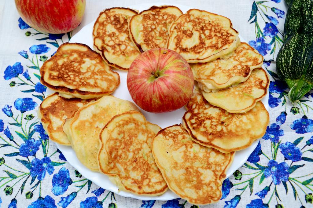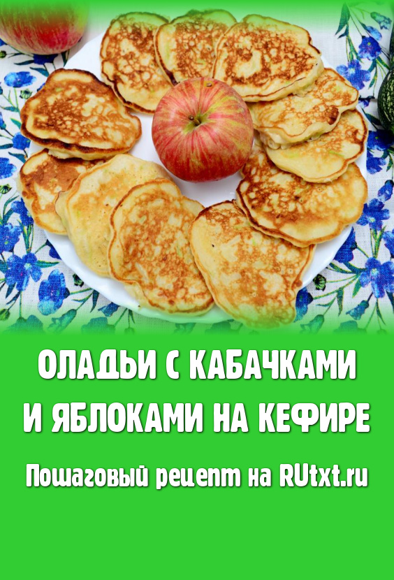 Оладьи, приготовленные с кабачками и яблоками на кефире, получаются пышными, нежными и очень вкусными. К столу их можно подать со сметаной.
