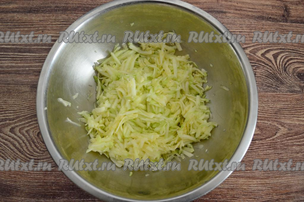Первым делом займёмся кабачком. Очистить кабачок от кожуры. Если у кабачка крупные семечки, тогда их нужно удалить. 400 грамм подготовленного кабачка натереть на крупной тёрке в глубокую миску, всыпать хорошую щепотку соли, очень хорошо перемешать и дать постоять, пока будем замешивать тесто.