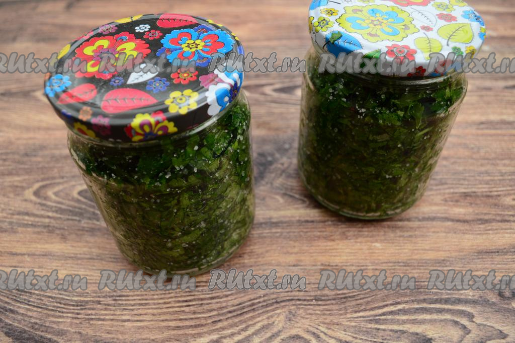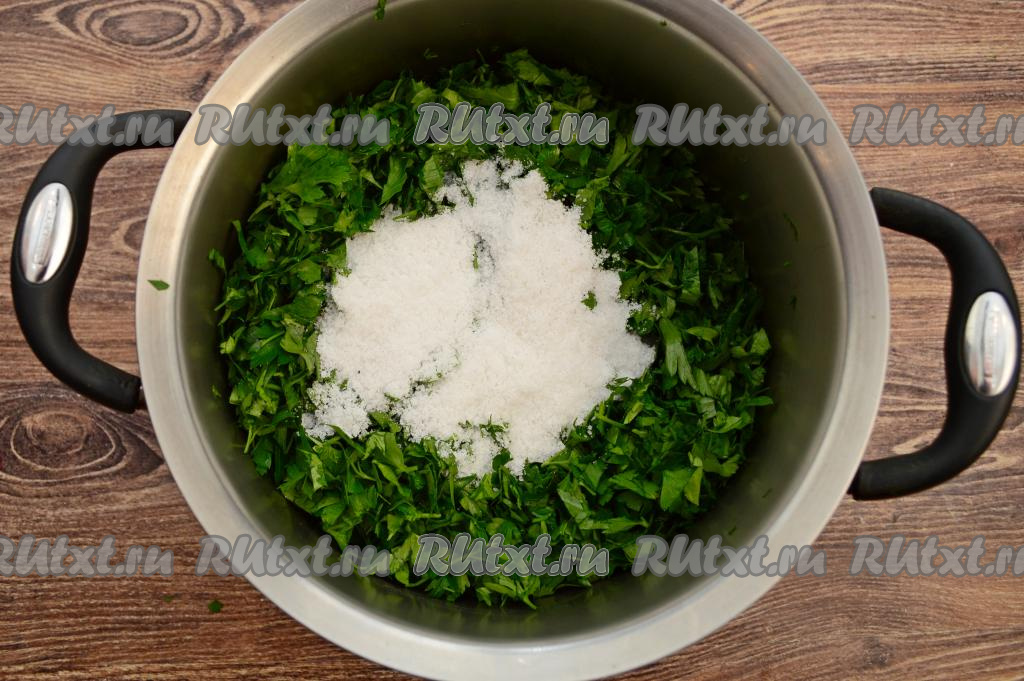 Добавить к петрушке соль. Количество соли должно быть равно примерно половине от веса петрушки. У меня было 240 грамм зелени петрушки, поэтому я добавила 120 грамм соли (это 4 столовых ложки с горкой).