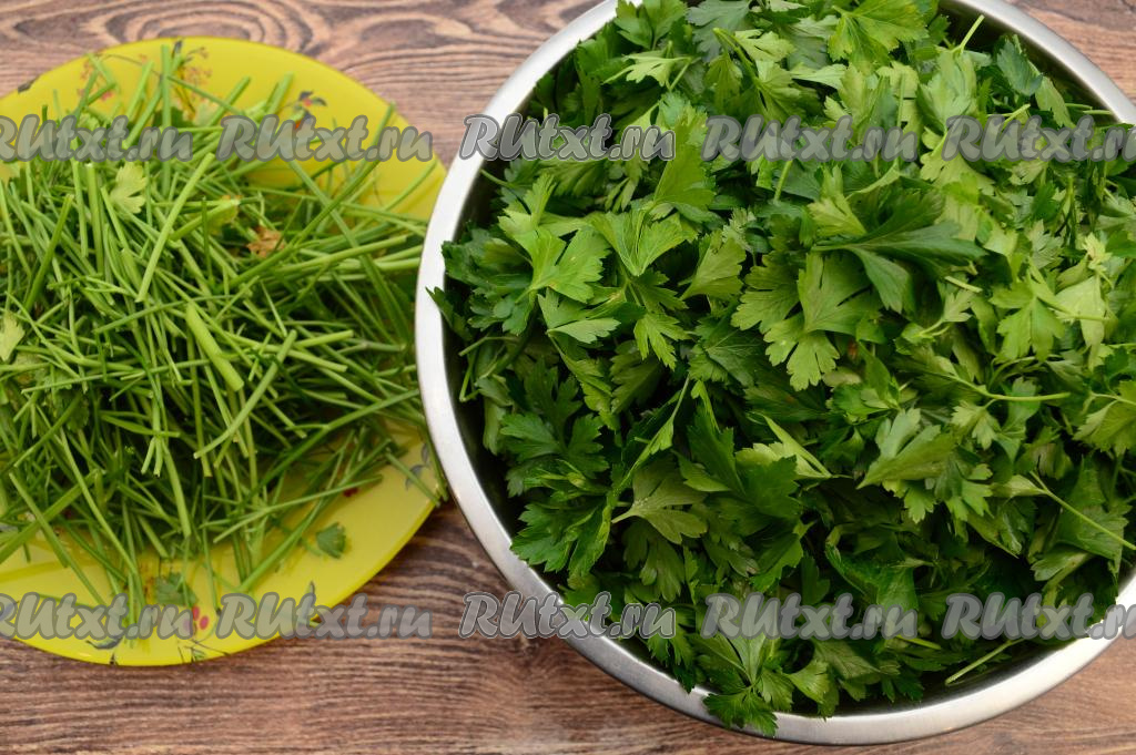 Когда петрушка обсохнет, нарезать её. Я люблю, чтобы петрушка была мелко нарезана, вы же нарезайте, как вам больше нравится. Сложить нарезанную петрушку в глубокую кастрюлю.