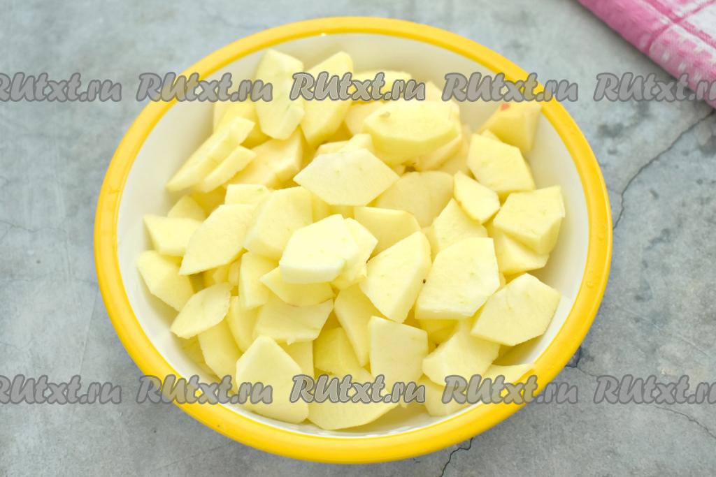 Достаём слоёное дрожжевое тесто из морозилки, оставляем его размораживаться при комнатной температуре (тесто должно стать достаточно мягким). Пока тесто размораживается, займёмся начинкой для пирога. Яблоки очищаем, удаляем семена. Нарезаем яблоки на небольшие ломтики.
