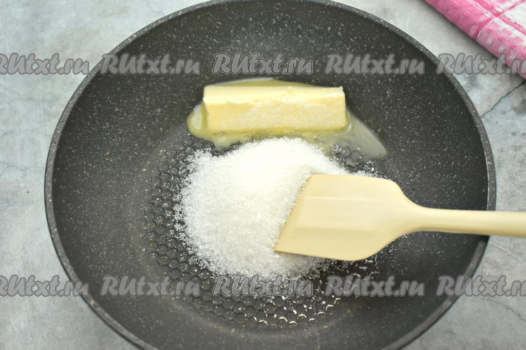 На сковороду выкладываем сливочное масло, всыпаем 2 столовых ложки сахара, ставим на огонь ниже среднего. Постоянно перемешивая, прогреваем до полного растворения масла. В результате прогревания масла с сахаром на сковороде получится карамельная масса.