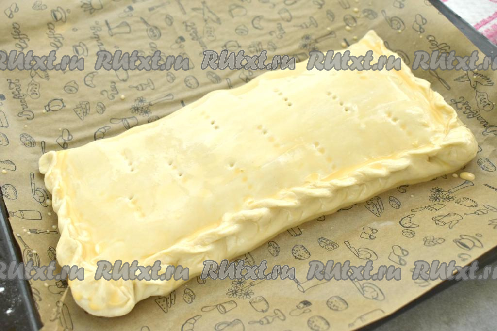 Начинку накрываем свободной стороной теста. Плотно скрепляем края теста, формируя закрытый пирог. На поверхности пирога делаем проколы вилкой. Оставляем пирог на расстойку при комнатной температуре минут на 20. Благодаря расстойке слоёное дрожжевое тесто получится более воздушным. В небольшой миске соединяем яичный желток и молоко, тщательно перемешиваем. По прошествии 20 минут смазываем поверхность пирога смесью желтка и молока.