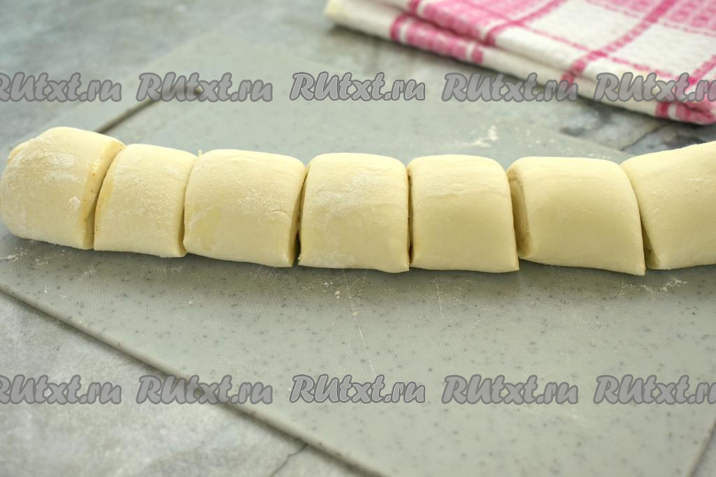 Разморозившийся пласт слоёного теста выкладываем на слегка присыпанную мукой поверхность и, не раскатывая, сворачиваем в плотный рулет. Разрезаем рулет на 7 равных частей.