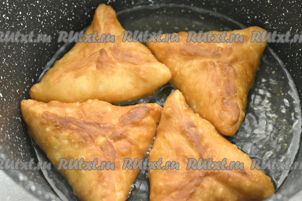 Постепенно жарим всю самсу из слоёного теста, периодически подливая масло в сковороду. Аппетитную самсу, хрустящую снаружи и сочную внутри, к столу подаём горячей или тёплой.