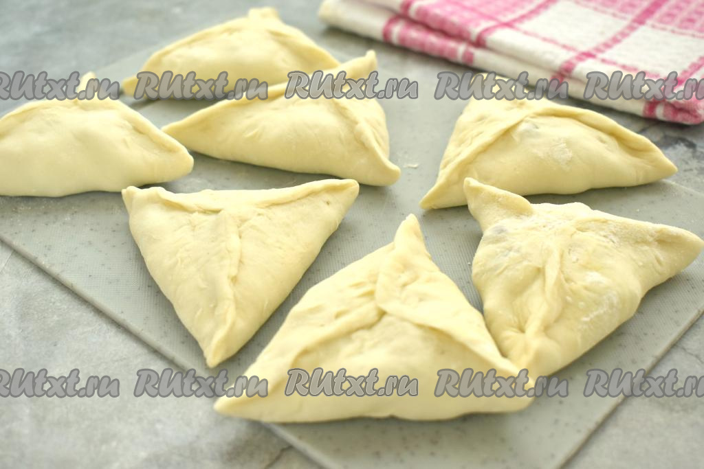 Соединяем края каждой лепёшки в форме треугольника над начинкой и скрепляем края, формируя треугольную заготовку самсы.