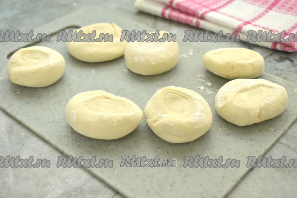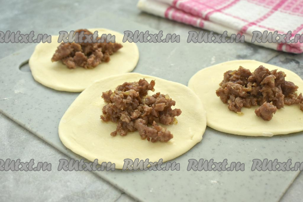 Раскатываем кусочки теста в лепёшки диаметром около 10-11 сантиметров. В центр каждой лепёшки кладём 1 столовую ложку остывшей начинки из фарша и лука.