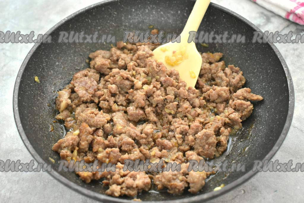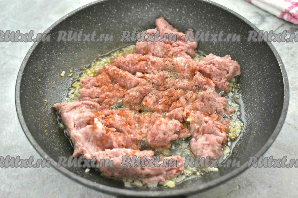 К обжаренному луку добавляем мясной фарш. По вкусу его солим, приправляем специями (у меня - чёрный молотый перец и паприка).