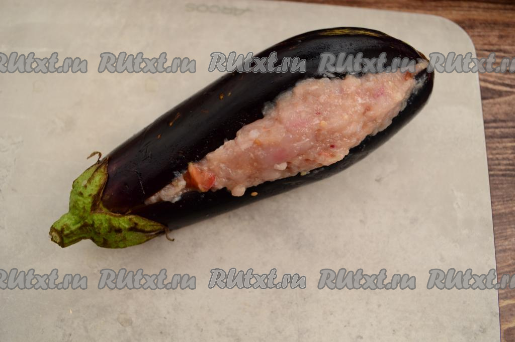 Посолить баклажан внутри, а затем наполнить его плотно фаршем.