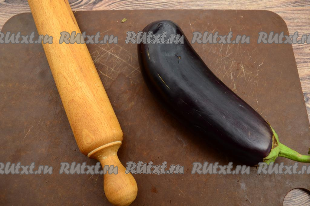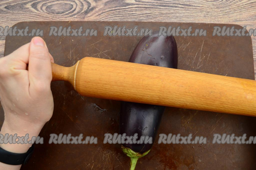 Вымыть баклажаны. Отбить каждый баклажан скалкой, чтобы он стал мягким и пластичным. Отбивать скалкой нужно со всех сторон, но не очень сильно, чтобы не разбить овощи и сохранить целостность кожуры.