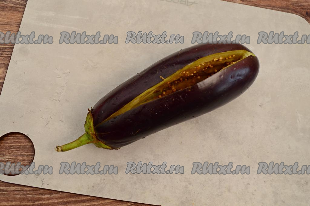 Каждый отбитый баклажан разрезать вдоль и раздвинуть немного разрез, сделав карман. Внутри хорошо отбитый баклажан будет полым, можно дополнительно руками прижать мякоть к кожуре, чтобы получилось больше места для начинки.