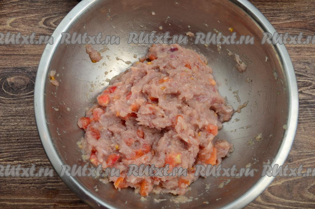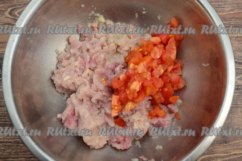 Помидоры вымыть, по желанию, очистить от кожуры, нарезать на небольшие кубики и добавить в миску с фаршем.
