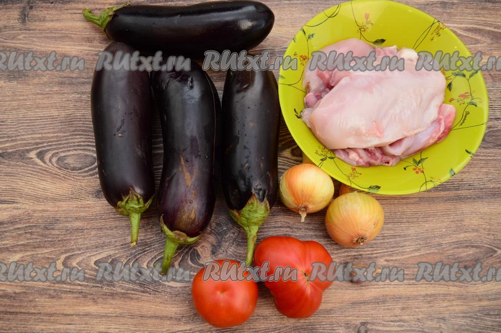 Подготовить продукты. Баклажаны выбирайте целые, без повреждений и желательно одинакового размера. Мясной фарш можно взять и покупной, но я предпочитаю готовить фарш в домашних условиях, перекручивая кусочки мяса через мясорубку (в качестве мяса для этого блюда можно взять, например, свинину, курятину, индейку, говядину, можно использовать одновременно и несколько видов мяса). В этот раз я сделала фарш из филе куриной грудки и филе бедра, пропустив их через мясорубку.