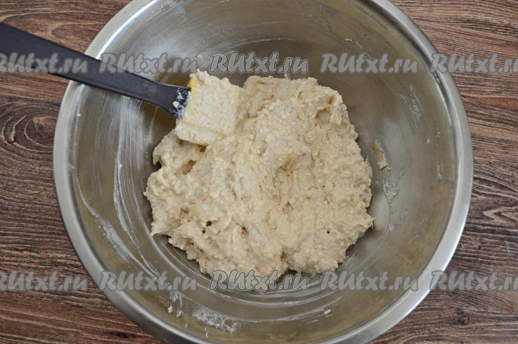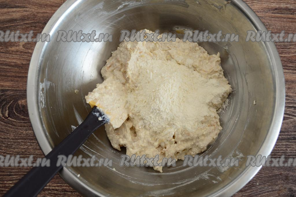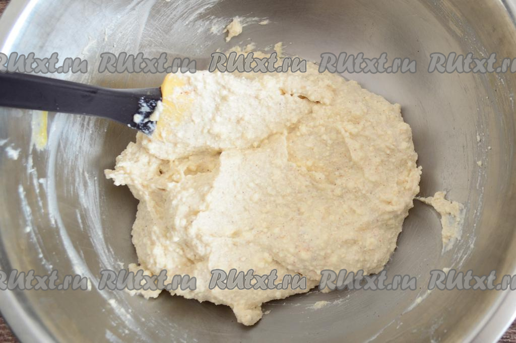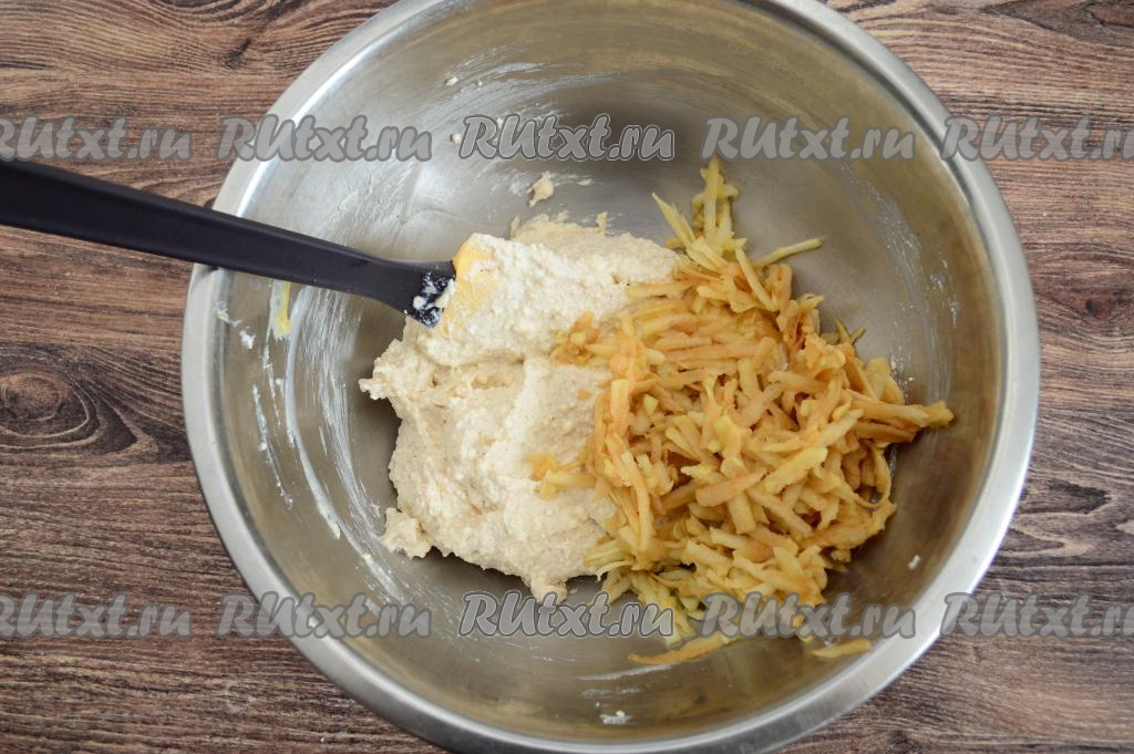 Затем всыпать 2 столовых ложки муки, вмешать лопаткой в творожно-яблочное тесто.